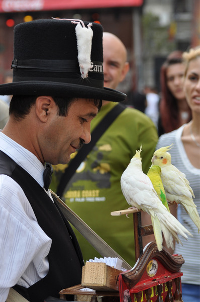simpatic...l-am vazut de mai multe ori prin oras... aici e haios soarecele cum i se prelinge pe palarie...:)