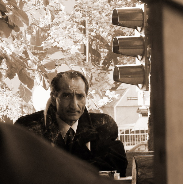 va felicit pentru acest cadru, foarte buna ideea virarii in sepia, fiind monocroma accentul cade strict pe privirea intrebatoare si usor taioasa a subiectului, desi pare departe de a fi un om rau... imi place cat de elegant este... ciudat cum in spate se vede un semafor...