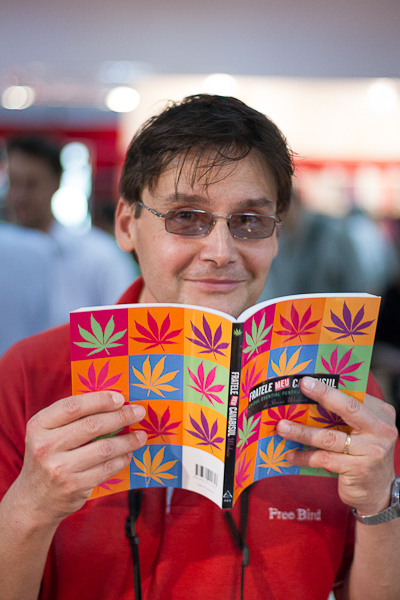 foarte reusit portetul asta:) nota 10 pt combinatia dintre cartea cu coperti colorate si titlul "fratele meu canabisul", textul "free bird" de pe tricou si zambetul clasic al lui andrei:)