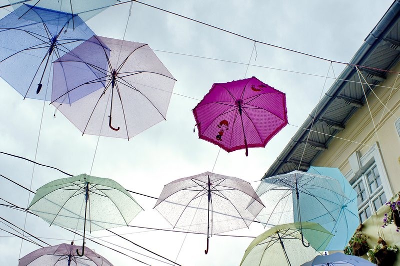 the umbrella on the far most right has most beautiful color: light aqua.