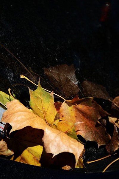 Frunze abandonate intre parbrizul si capota unei masini.